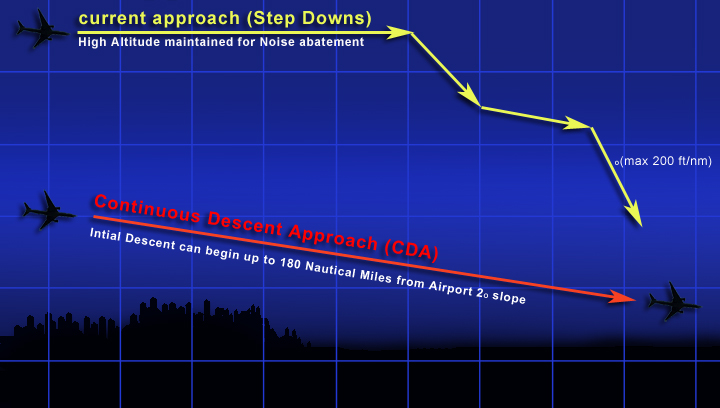 The FAA wanted to implement Continuous Descent Approach (CDA) at La Guardia as part of the Regional Airspace Redesign to reduce the noise impact when they terminalized a much larger area. In the Draft Environmental Impact Study (DEIS) CDA was included however CDA failed the safety field test in the summer of 2007 and was not included in the Final Impact Study(FEIS).